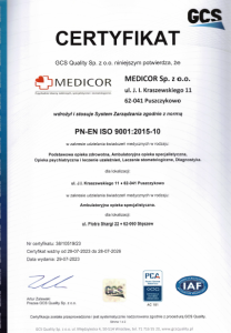 Medicor Sp. z o. o. posiada certyfikat jakości ISO 9001:2015. Jest to świadectwo spełniania wymagań międzynarodowej normy oraz zobowiązanie do ciągłej poprawy jakości świadczonych usług medycznych.